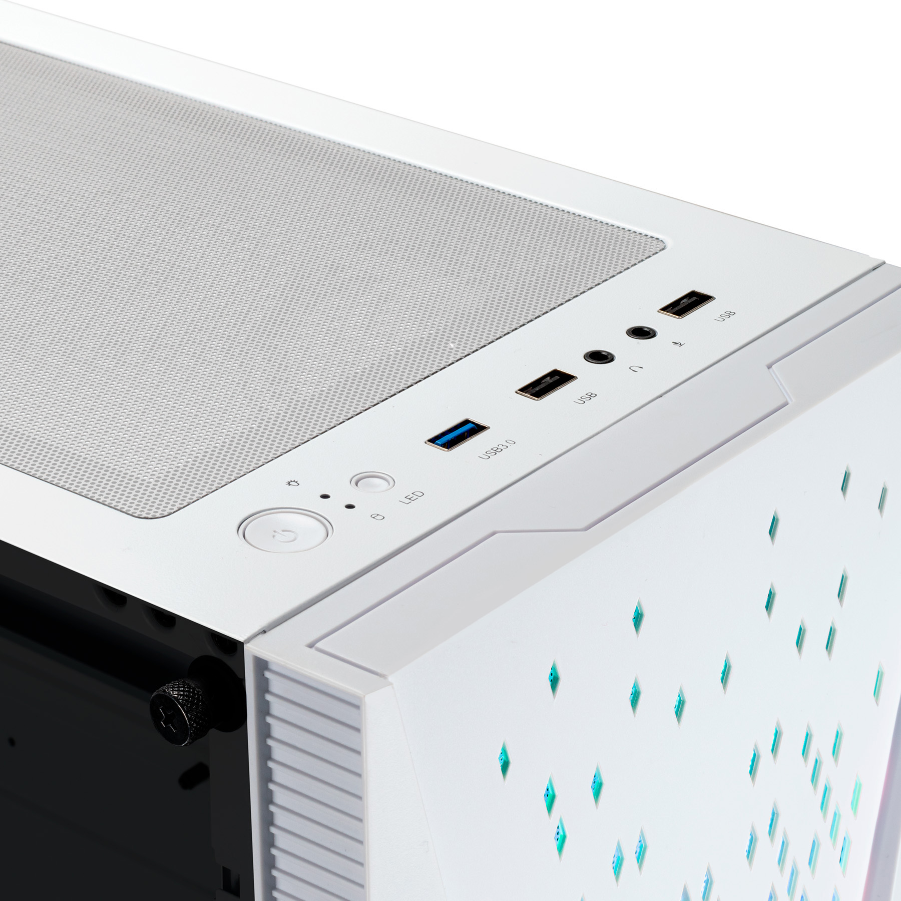 O painel superior está equipado com uma porta USB 3.0 e duas portas USB 2.0, permitindo-lhe ligar facilmente vários dispositivos ou periféricos e carregar acessórios. Além disso, possui um conetor para auscultadores e microfone. O filtro superior não só ajuda a arrefecer, como também protege o interior do seu equipamento.